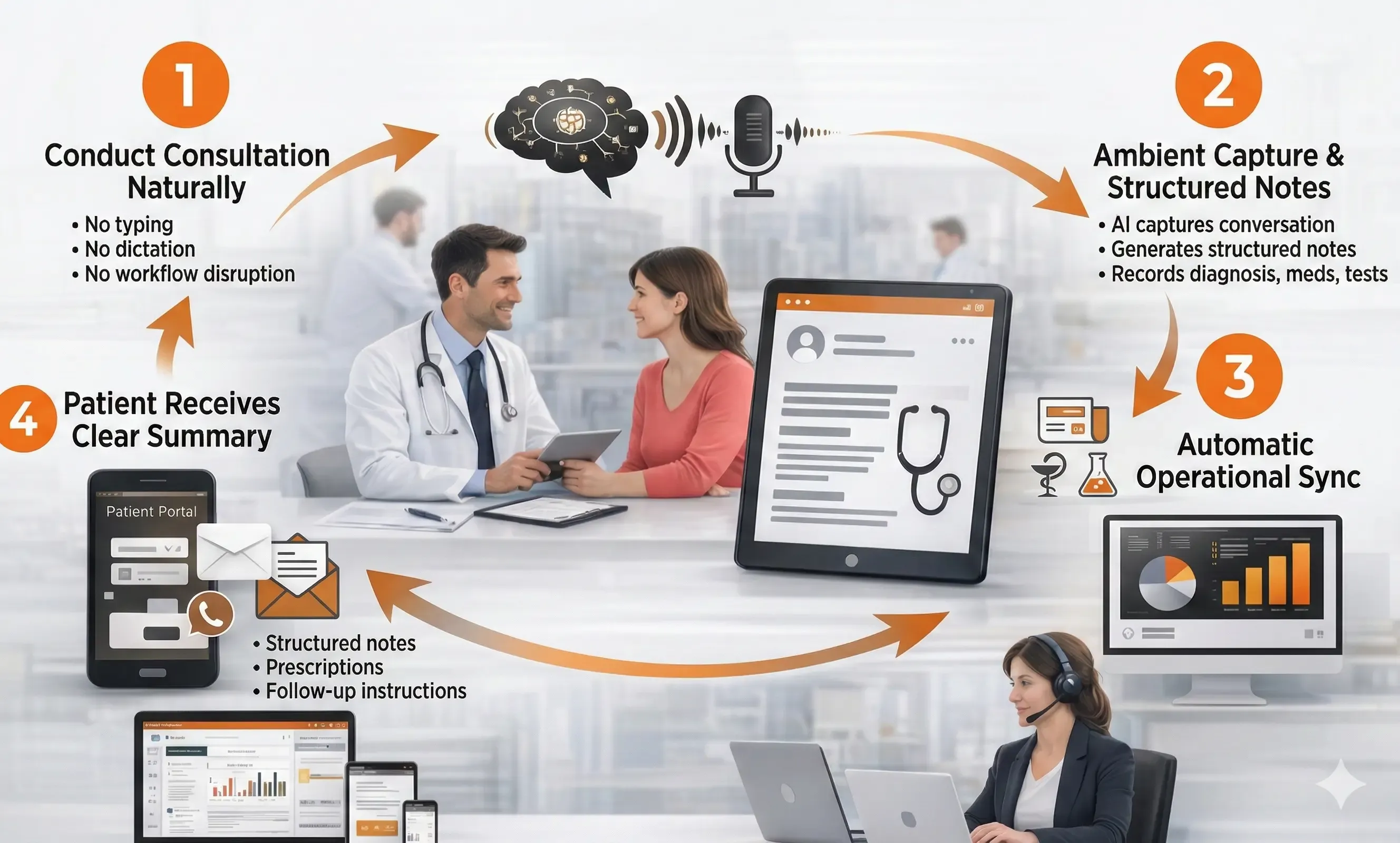 You stay focused on the patient while the system handles documentation.