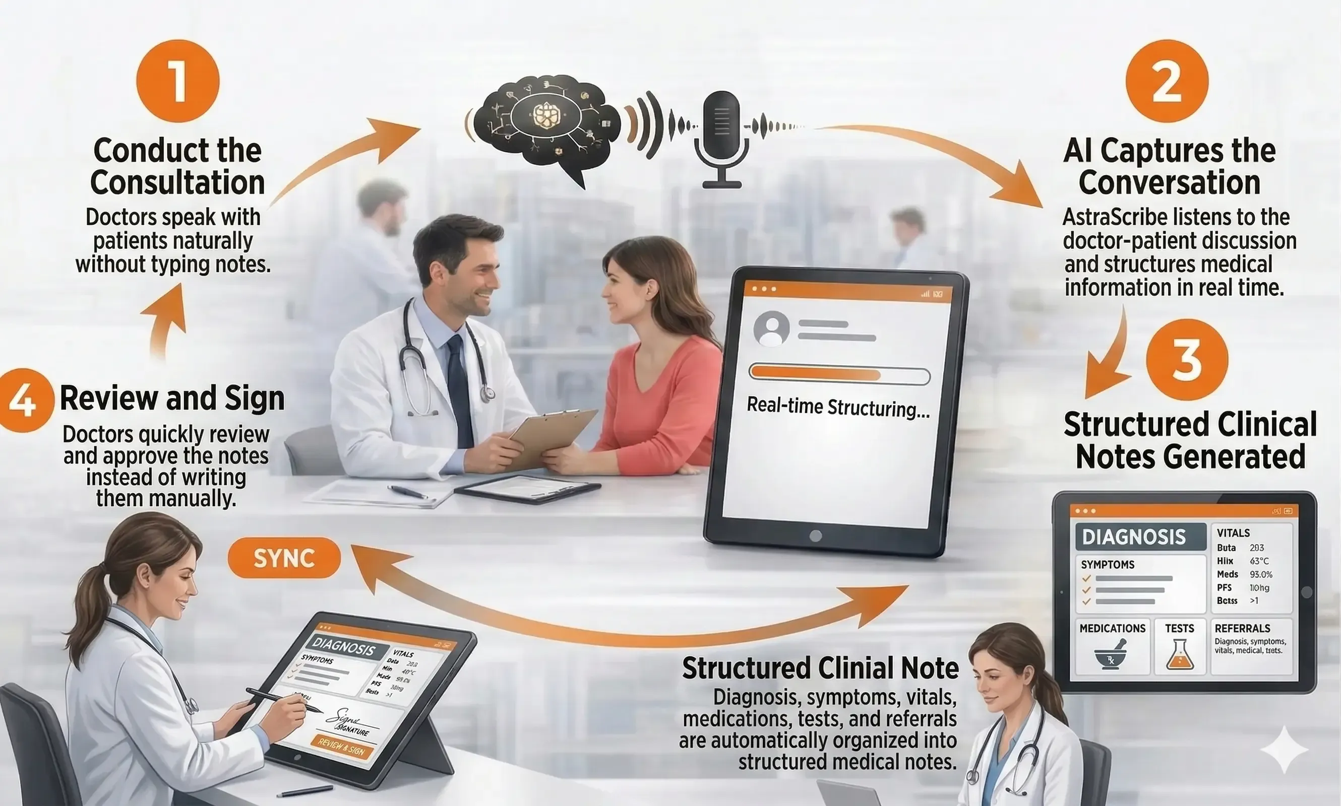 AstraScribe allows doctors to conduct consultations naturally while AI automatically creates structured clinical documentation.