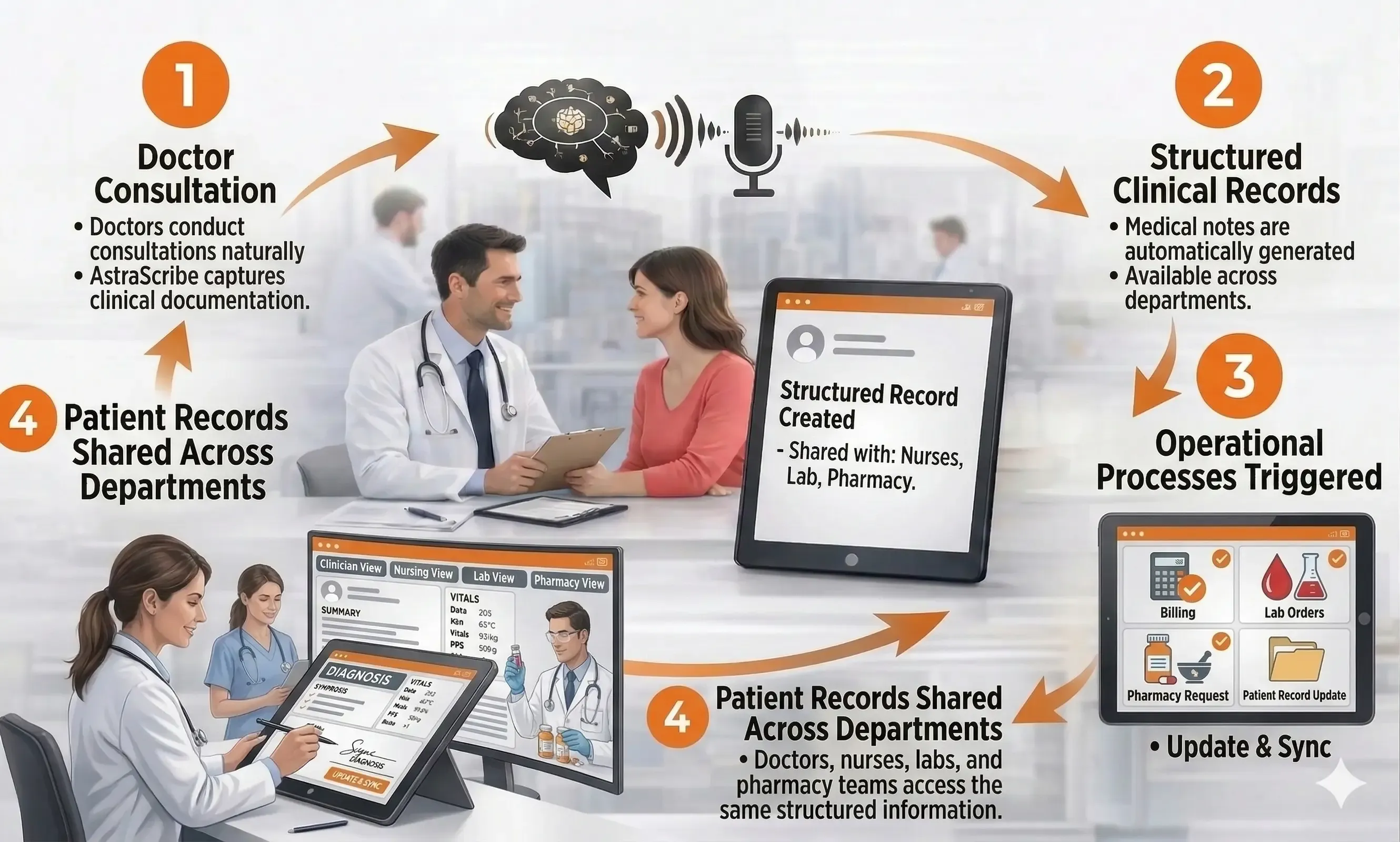 AstraScribe connects clinical documentation, hospital workflows, and operational analytics into one integrated system.